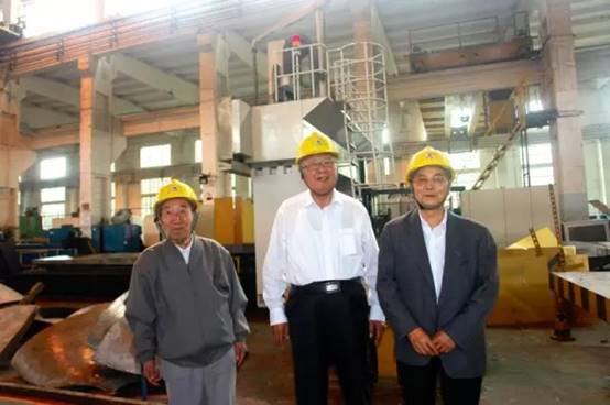 2013年梁维燕(左二)和嵇兆琛、青长庚在哈尔滨电机厂(昆明)有限责任公司车间考察